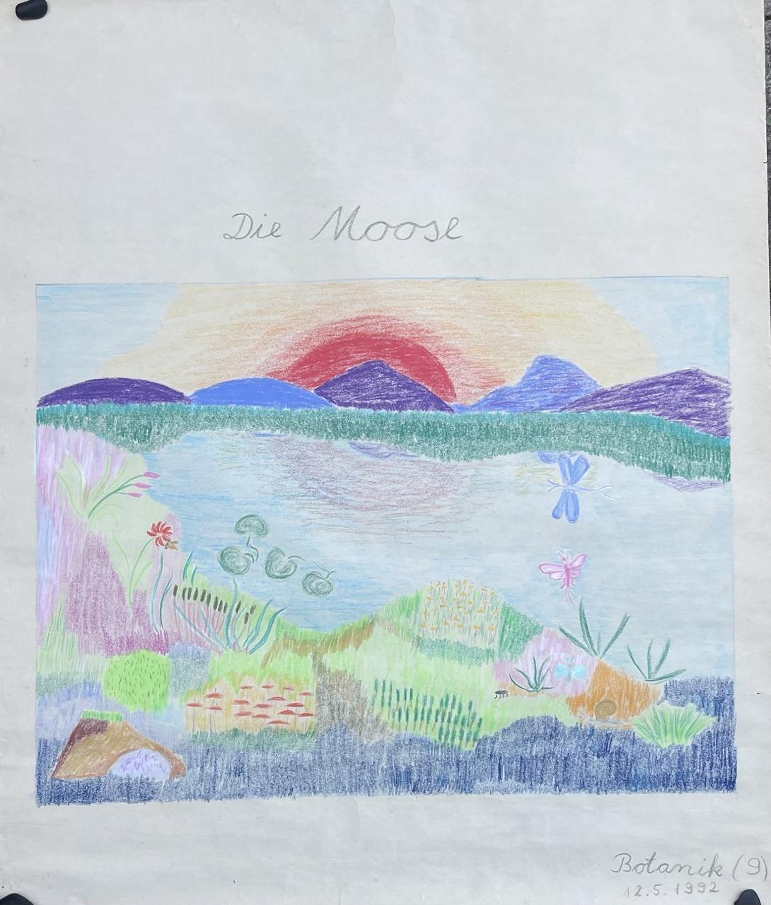 Für weniger geforderte Kinder spiegelte ich bei meiner Tafelarbeit z. B. zusätzlich den Sonnenaufgang bei Moosen auf die Wasserfläche des Sees, der ansonsten „windgekräuselt“ war.