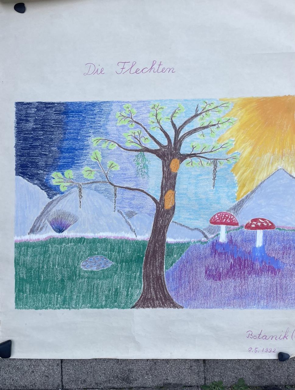Während der vierwöchigen Pflanzenkunde ließ ich für die Kinder an der Tafel auf weißem DIN A1-Flipchart-Papier alle Pflanzenblätter des auf einer Staffelei ausgestellten Botanikbuches mit Caran-d’Ache Kunstkreiden entstehen.
