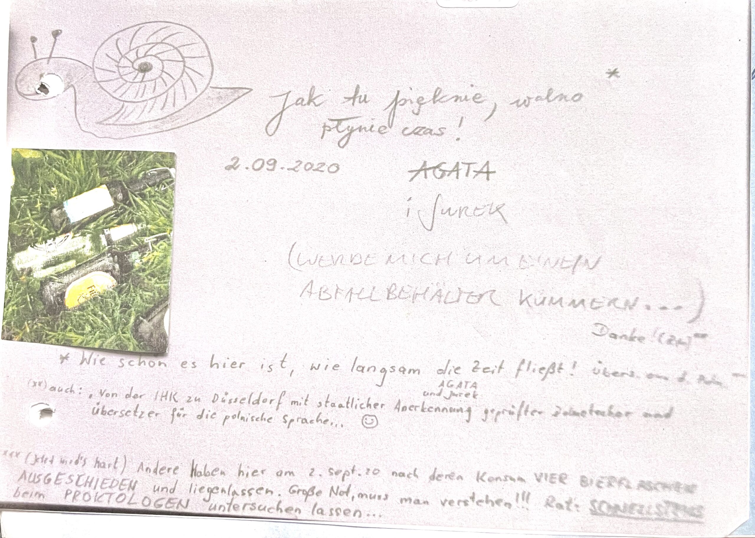 Einträge Band 8 sind bis zum 15.03. kopiert festgehalten*, Einträge Band 7 sind bis zum 25.01. kopiert festgehalten*, Einträge Band 6 (fast voll) bis zum 25.12. siehe dort *, Einträge Band 5 siehe dort (20.09.2020-07.11.2020)*, Einträge Band 4 siehe dort (29.08.2020-20.09.2020) *, Einträge Band 3 siehe dort (10.07.2020-28.08.2020) *, Info zu Band 1+2 (29.06.2020 und 29.06.2020-06.07.2020) siehe Einleitung zu Band 3… * Achtung, Band 3,4,5,6 sind seit dem Sturm am 27.12.20 verschwunden, Band 7 aber wurde samt Info am 29.01.21 entwendet, die Zwischeninfo verschwand am 31.01.21. Alle inzwischen etwa 130(!) Eintragungen der 8 Vorgänger-Büchlein sind von mir fotografiert worden und damit nicht verloren. Hier nun schon Band 9. Band 8 (hier ausgelegt vom 02.02.2021 an) ist am 17.03.2021 geklaut worden…