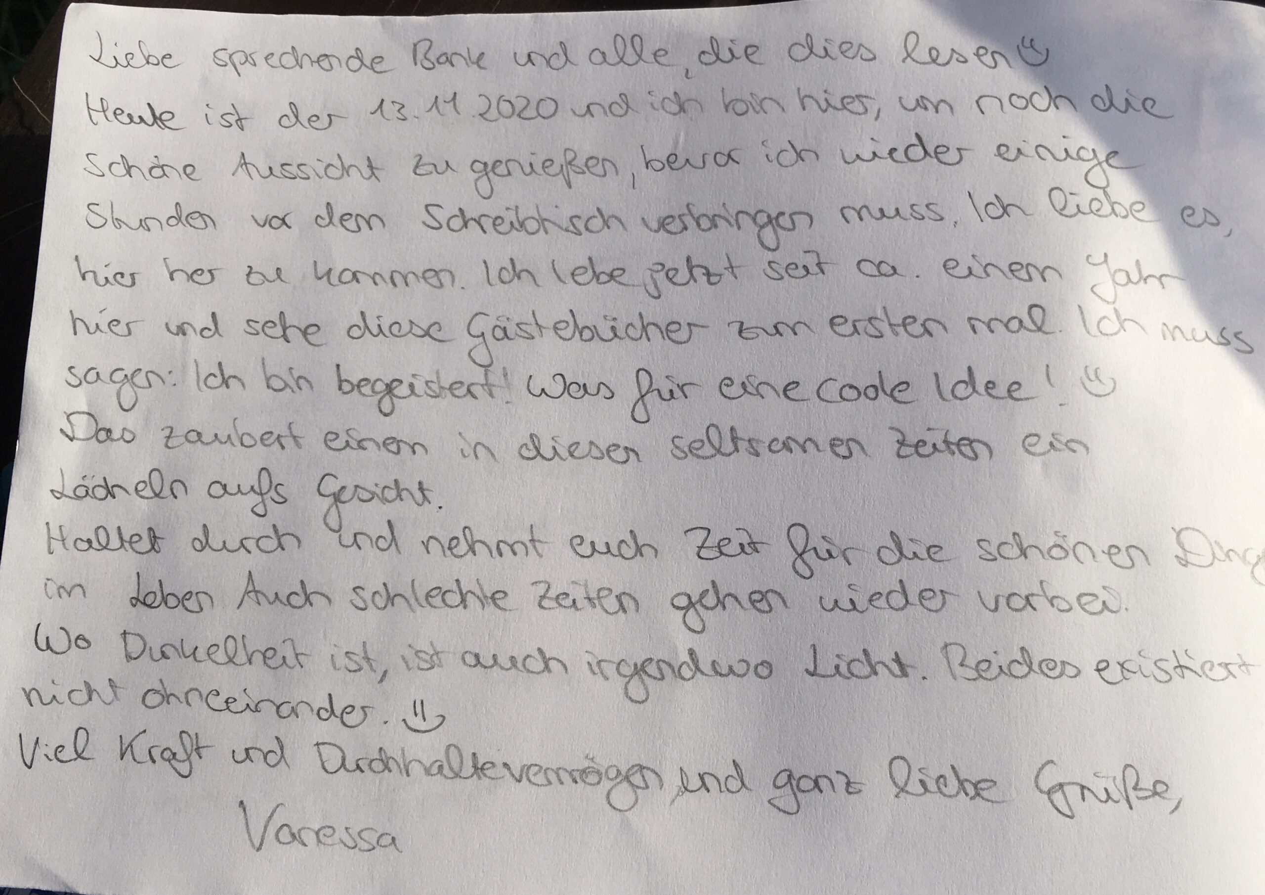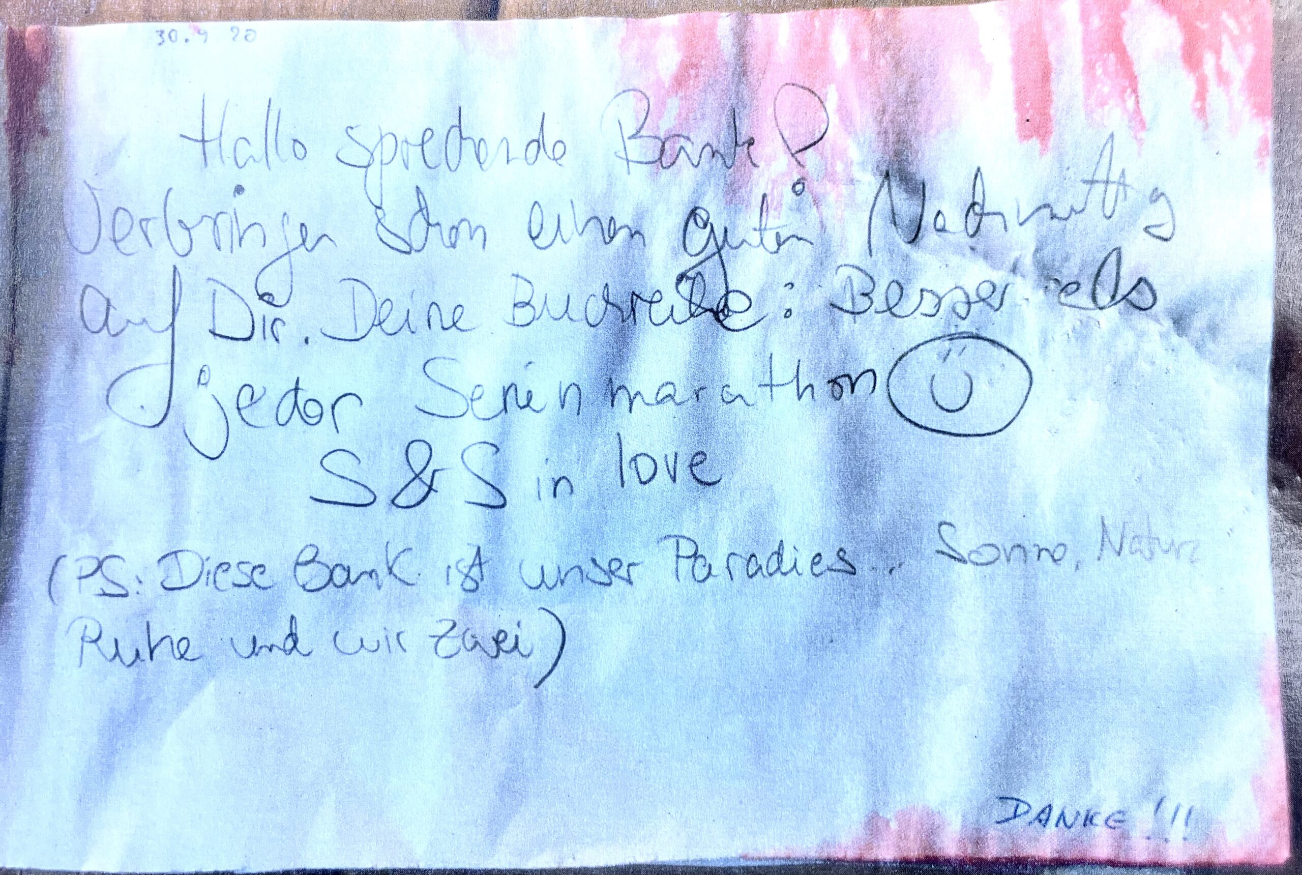 (DANKE! R.M.,27.8.20 Anm.Mr: Auf der Abendfahrt per Rad zum Tippelsberg (da regnete es noch nicht) begegnete ich kurz der jungen Frau. Bei der Rückfahrt (es regnete nicht mehr) fand ich die obige Eintragung, schrieb DANKE und fotografierte sie nachts)