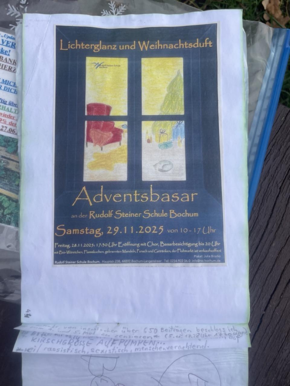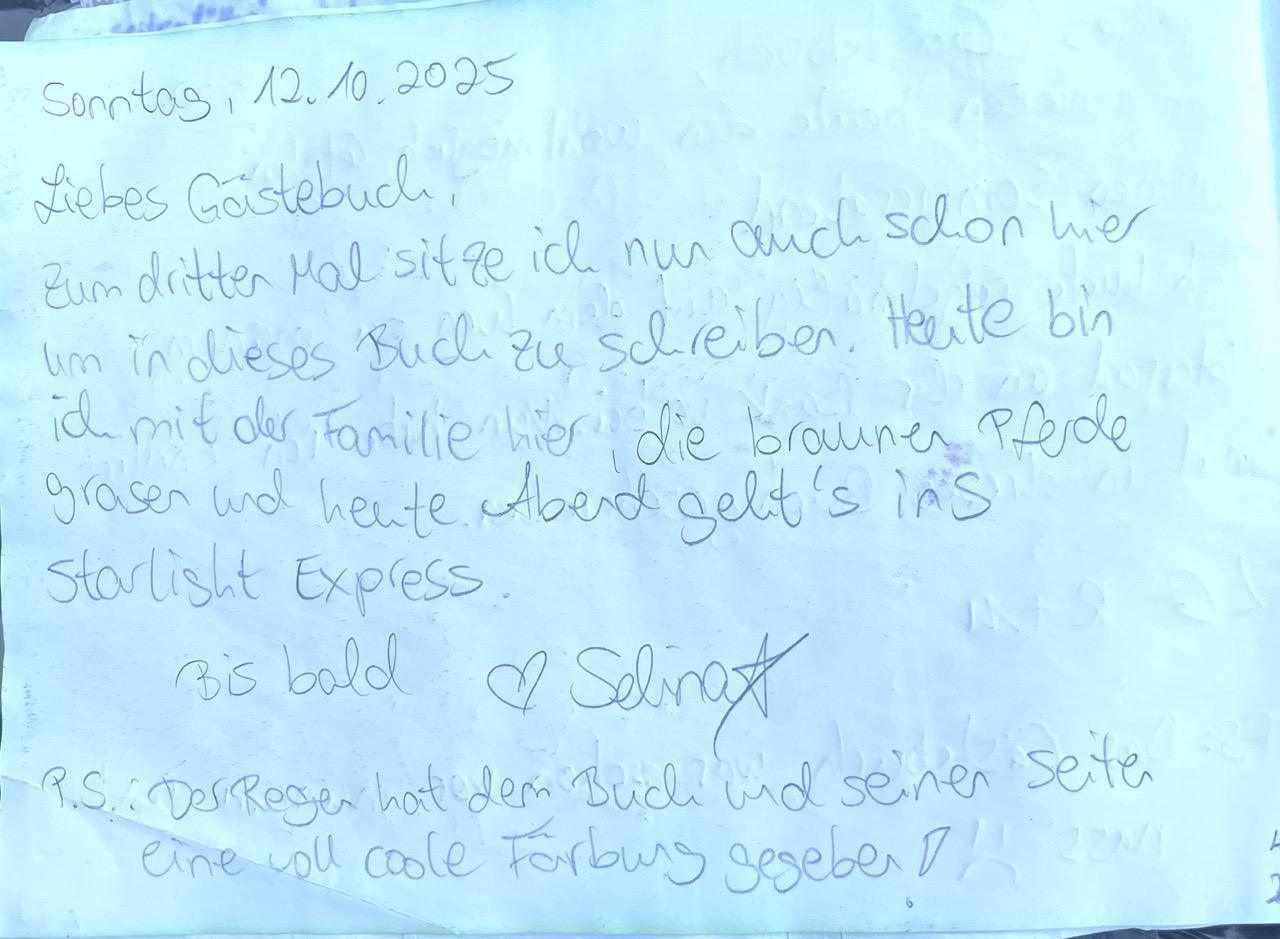 Der Eintrag von LA(?) am. 03.03.25 hat es inhaltlich nicht geschafft, in die Liste der im Blog in fast 5 Jahren inzwischen veröffentlichten 524 Einträge der „sprechenden Bank“ aufgenommen zu werden. Er ist aber noch im bald vollen, auf der Bank ausliegenden, Band 36 einzusehen. Sollte der Autor ihn qualitativ aufwerten, bevor Band 37 ausliegt, wird er hierher doch noch „aufsteigen“, und anstelle dieses Beitrags platziert.