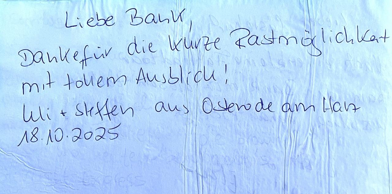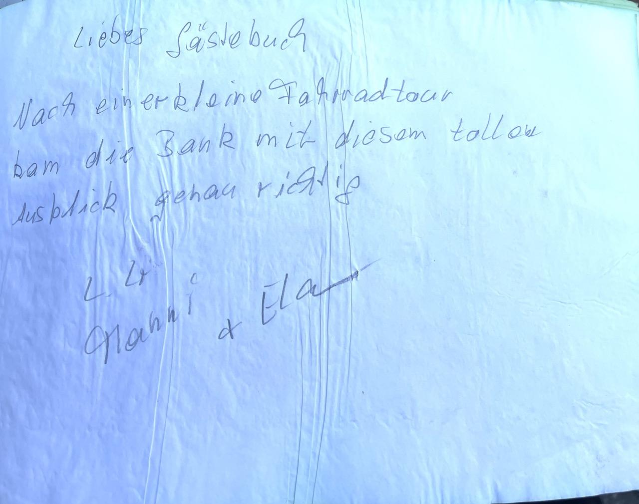 Allen jenen, welchen es während der „Anwesenheit von Band 41“ auf der Bank nicht möglich ist „vor Ort“ zu sein (selbst Freunde aus Taiwan haben sich schon einmal eintragen können) stelle ich nachfolgend ergänzende Infos zur Verfügung, wie sie gegenwärtig im „restaurierten“ Büchlein für alle „Bankbesitzer“ einzusehen sind.