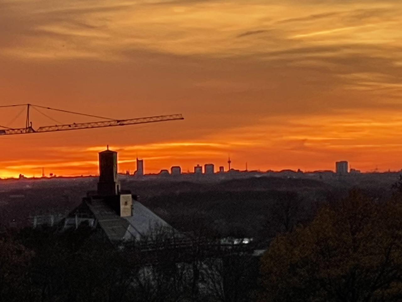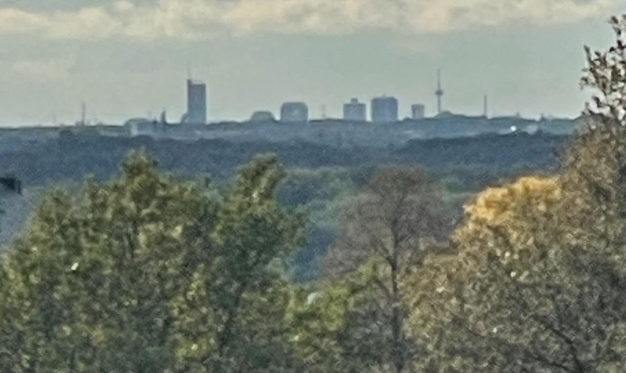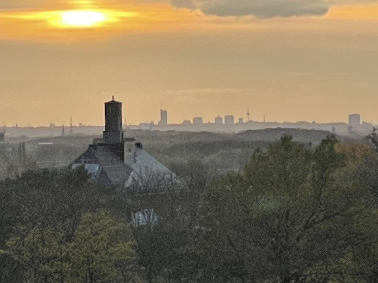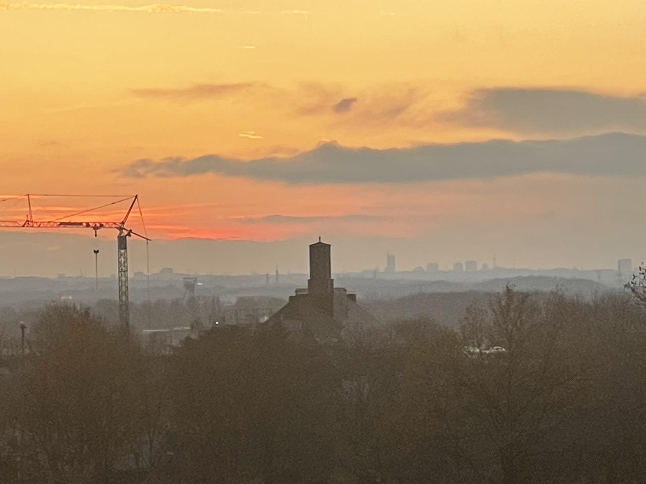 „545“: Ausblick nach Essen kurz vor Sonnenuntergang am Karfreitag 2025.