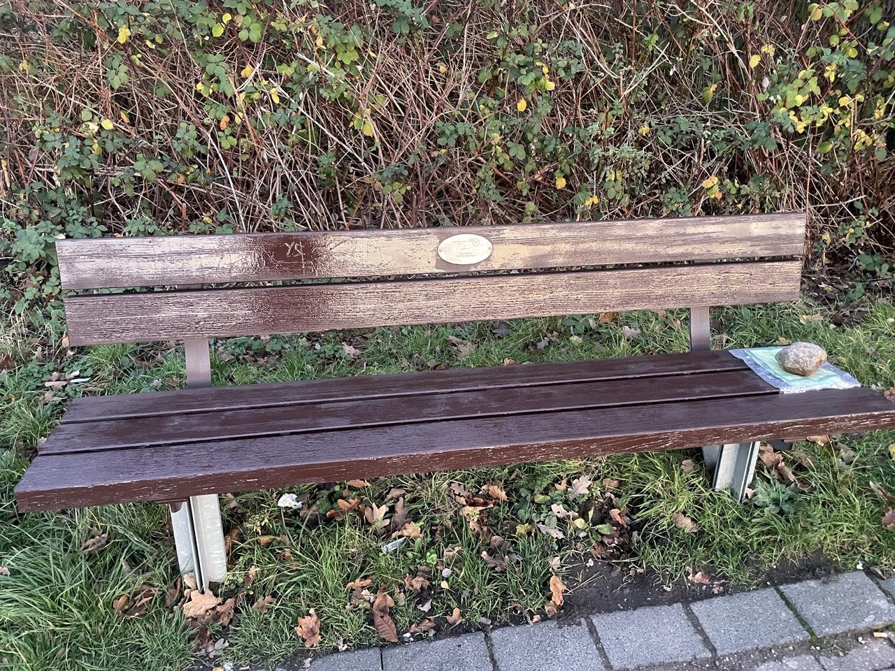 Und schon wieder habe ich, wie seit August 2020 bereits zum zehnten Mal die „sprechende Bank“ verbotenerweise beschädigt, indem ich alte Lackreste mit der Drahtbürste entfernte und mit einer Dose wetterfesten Lacks (Kosten 9.99 €) übersprühte. Diese Bank wurde während meiner „offenen Patenschaft“ in bald 5 Jahren nur einmal mit Tags traktiert (ich weiß wer es war).
