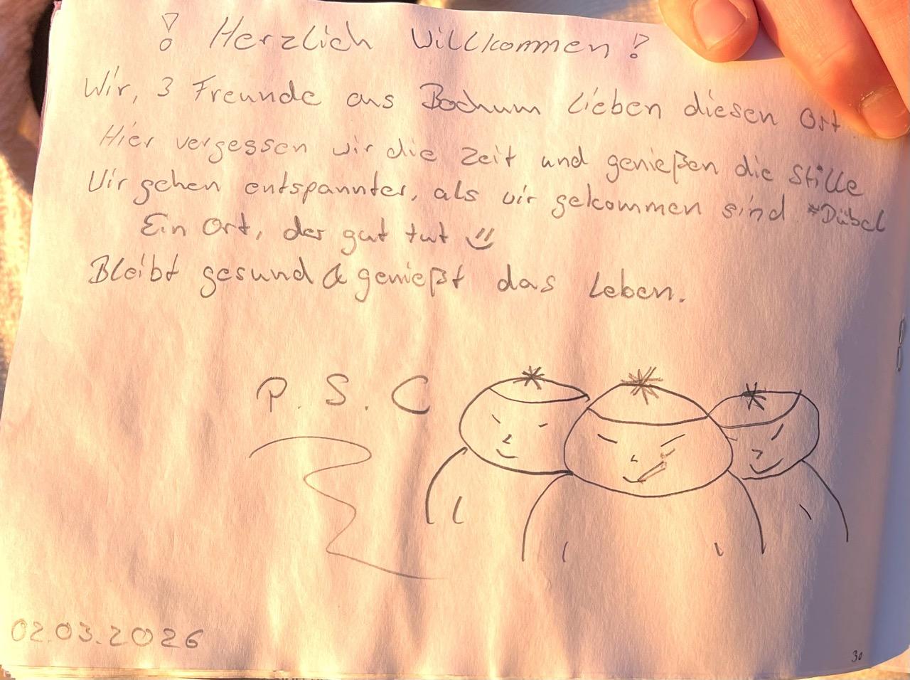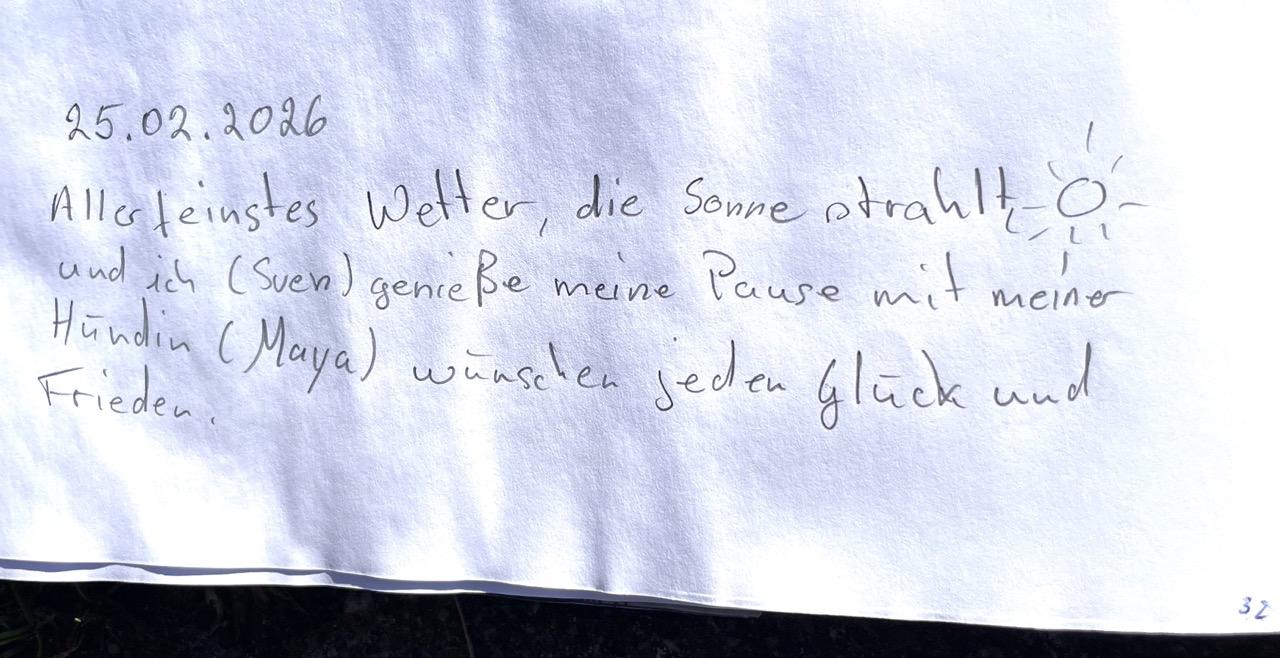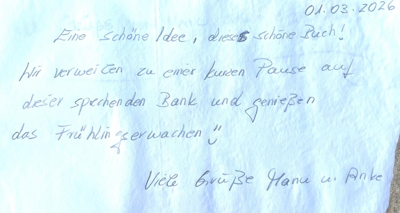 - Geschätzt tragen sich nicht mehr als 1% der Bankbesitzer in die Büchlein ein. Im Sommer sind es bis zu fünf Beiträge täglich, im Winter kann es mitunter einen Monat lang dauern, bis 5 Einträge zusammenkommen. Der erste Eintrag erfolgte 2025 übrigens am 12. Januar. Im Blog nummeriere ich eure wie meine Beiträge fortlaufend. Zur Unterscheidung setze ich meine Informationen aber seit Jahren in Anführungszeichen. Sie sind (wie die heutige) als Zusatzinformationen und Anregungen für jedermann gedacht. Manche davon findest Du aber nur digital im Blog vor. Die Eintragung von Theresa und Rita S. 11/ 28.12.2025(DANKE!) trägt die Nr. 669; diese Neujahrswünsche werde ich dort unter der Nr. „672“ platzieren.